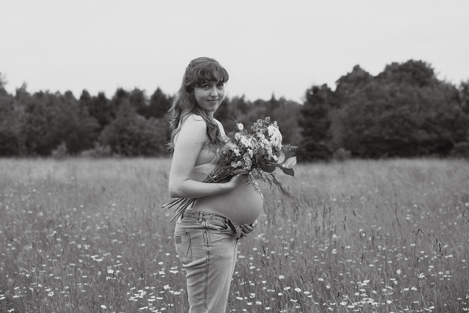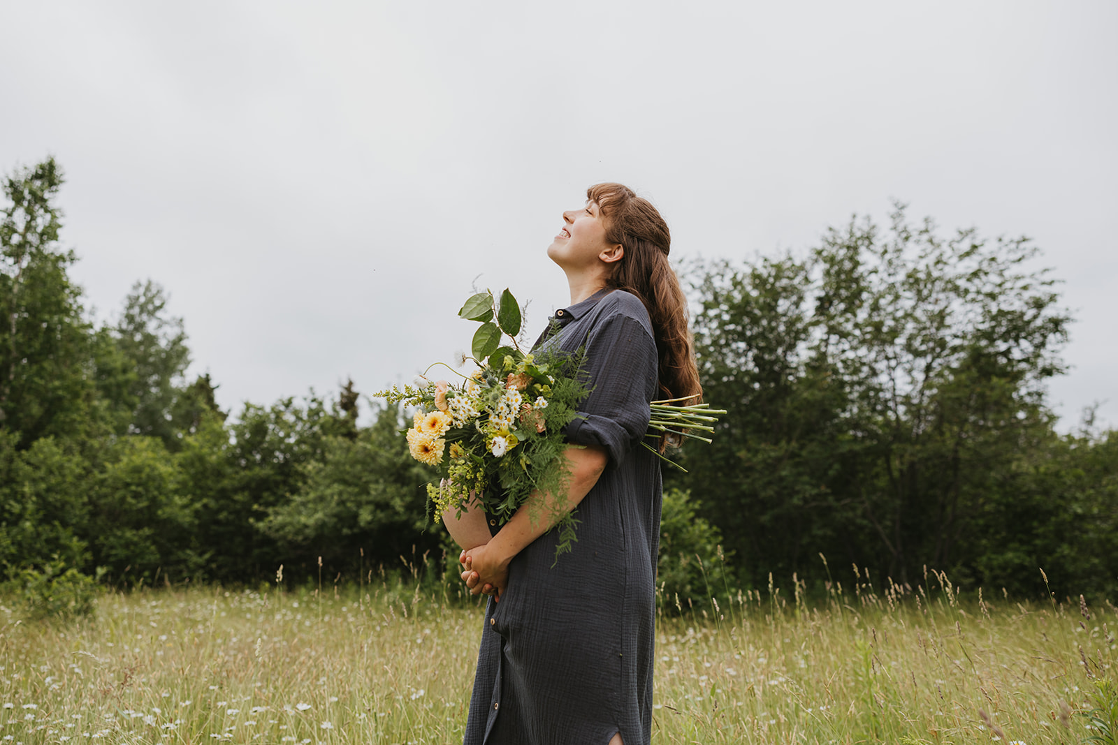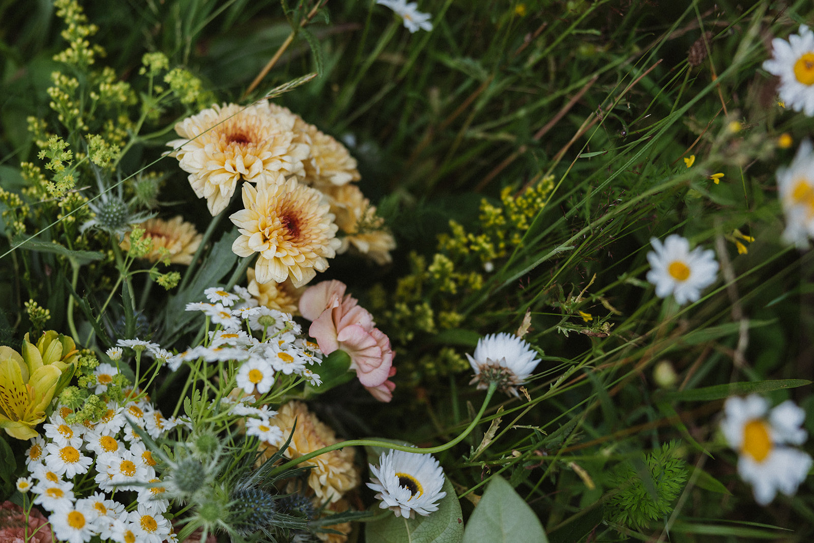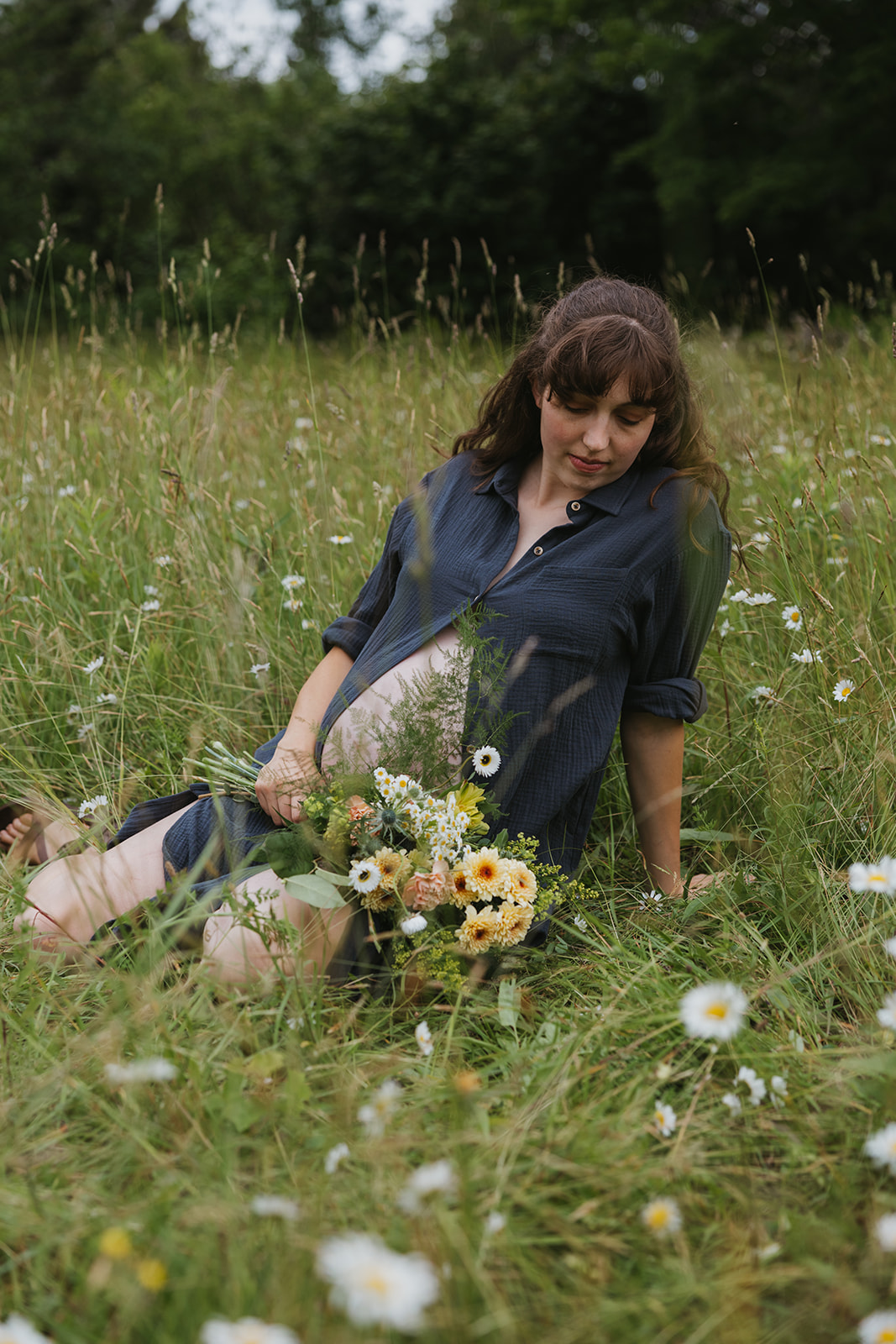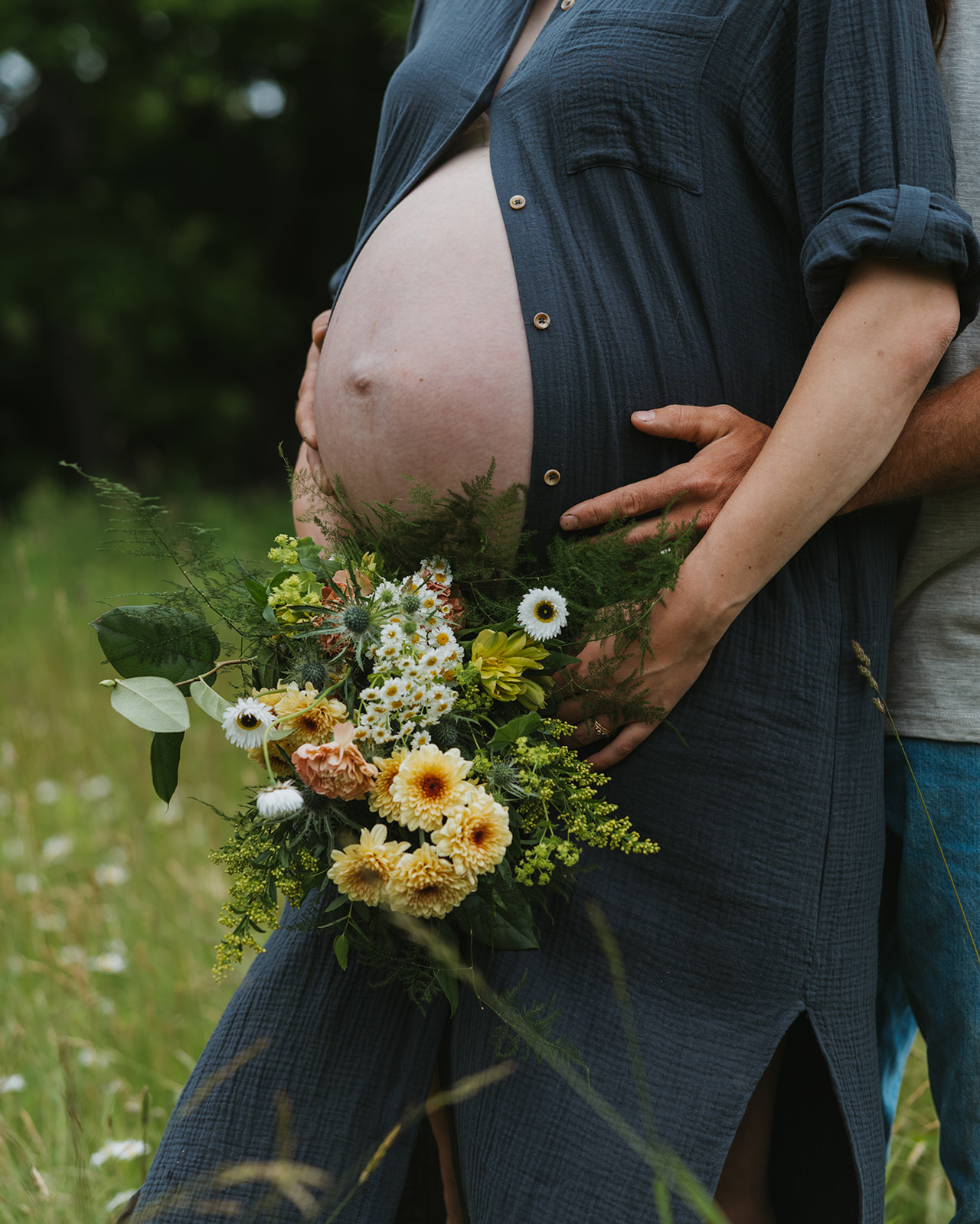 As it turned out, the field did have its own mix of grasses and natural growth, which paired easily with the bouquet. We used the flowers throughout the session, sometimes more prominently and sometimes more subtly, depending on the moment.