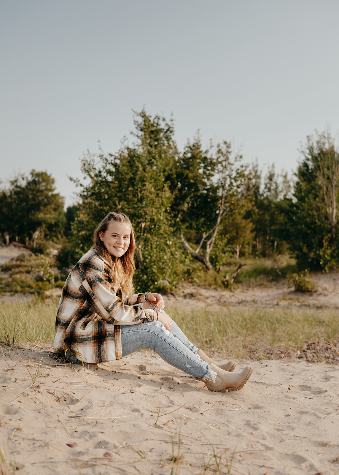 We planned Abi’s session to begin later in the evening so the light would be soft. This also meant fewer people on the beach and a calmer pace overall. The session flowed primarily at Eagle River beach, using the dunes, shoreline, and tree line for variety, before transitioning to her grandparents’ property for the final portion.