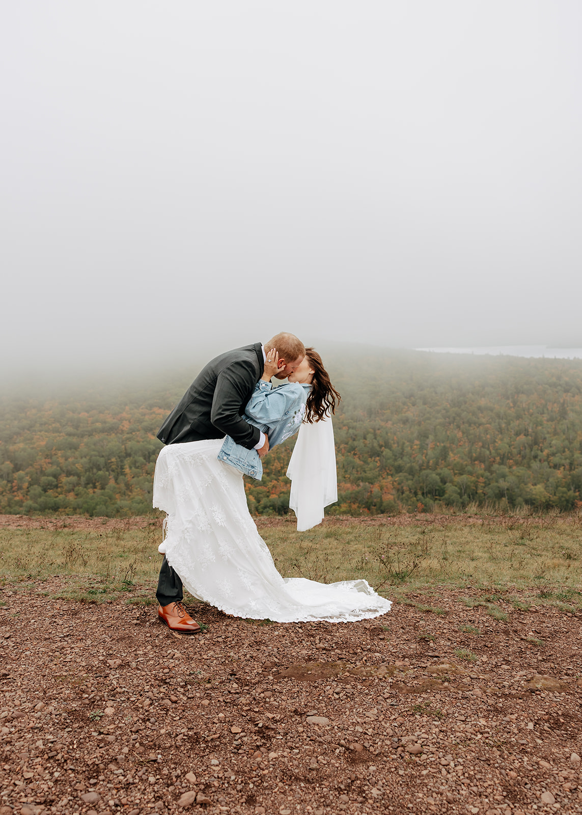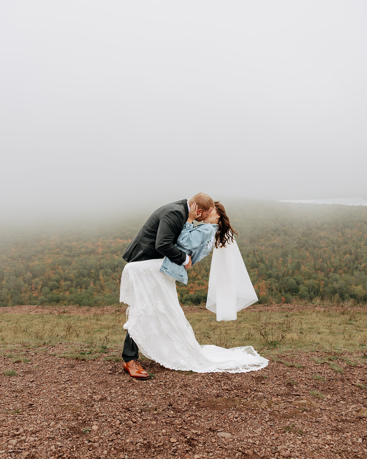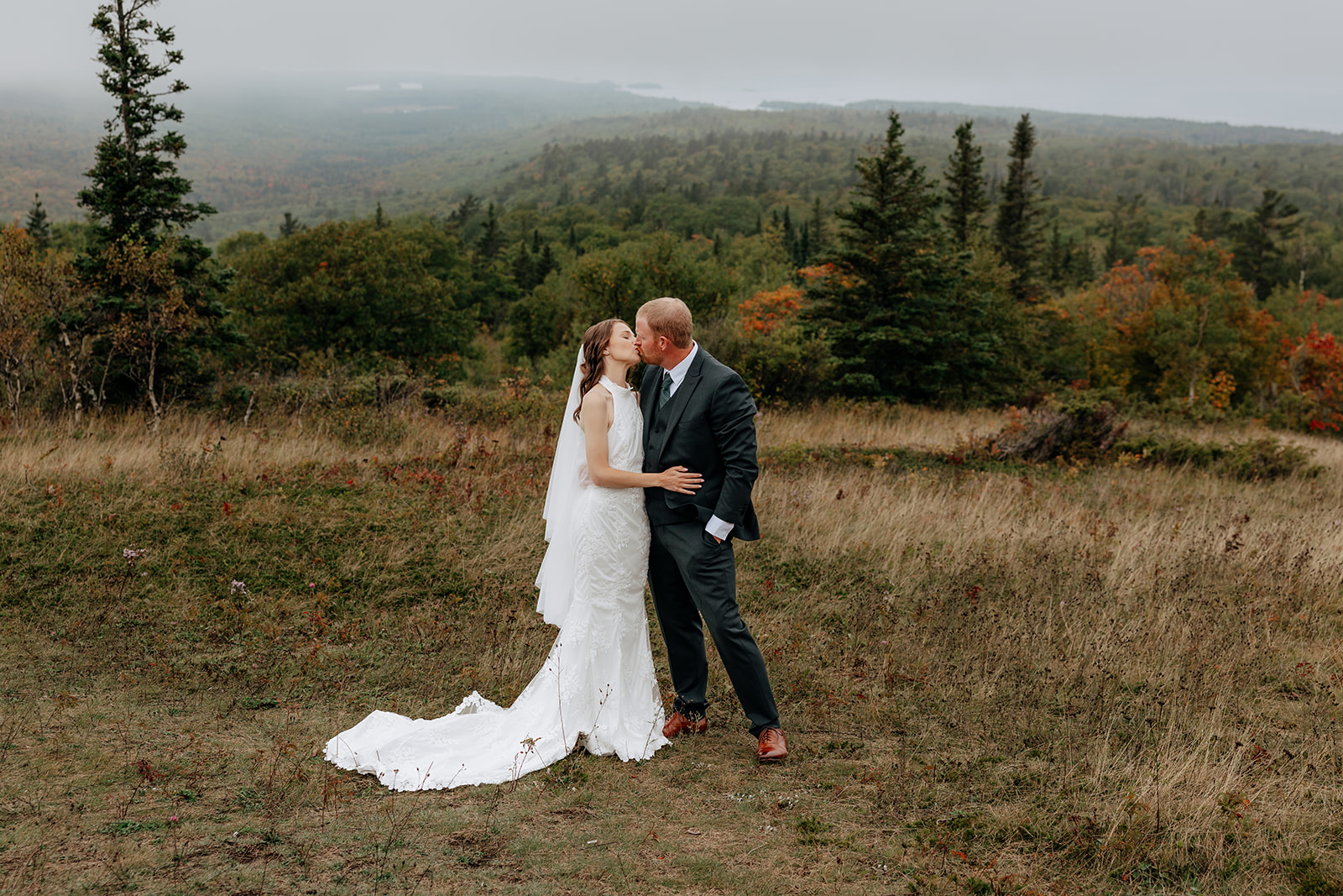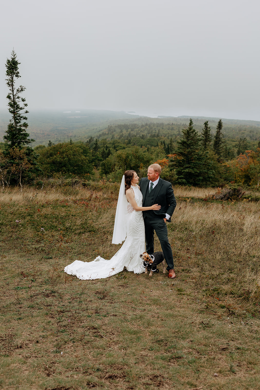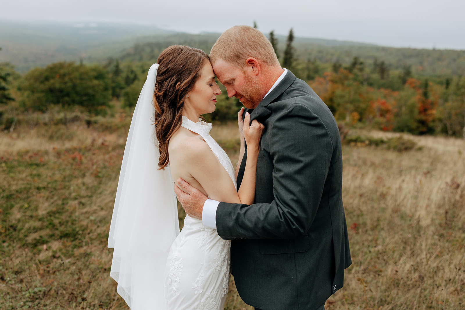 At the top of Brockway Mountain, the view opened up with a little bit of fog, creating a beautiful, moody fall backdrop. Lake Superior stretched out below on either side, and the Keweenaw Peninsula felt quiet and still. Copper Harbor had always been a place Crystal and Scott wanted to see, and standing there together, they got to take in a new place and enjoy the stillness of a weekday elopement.