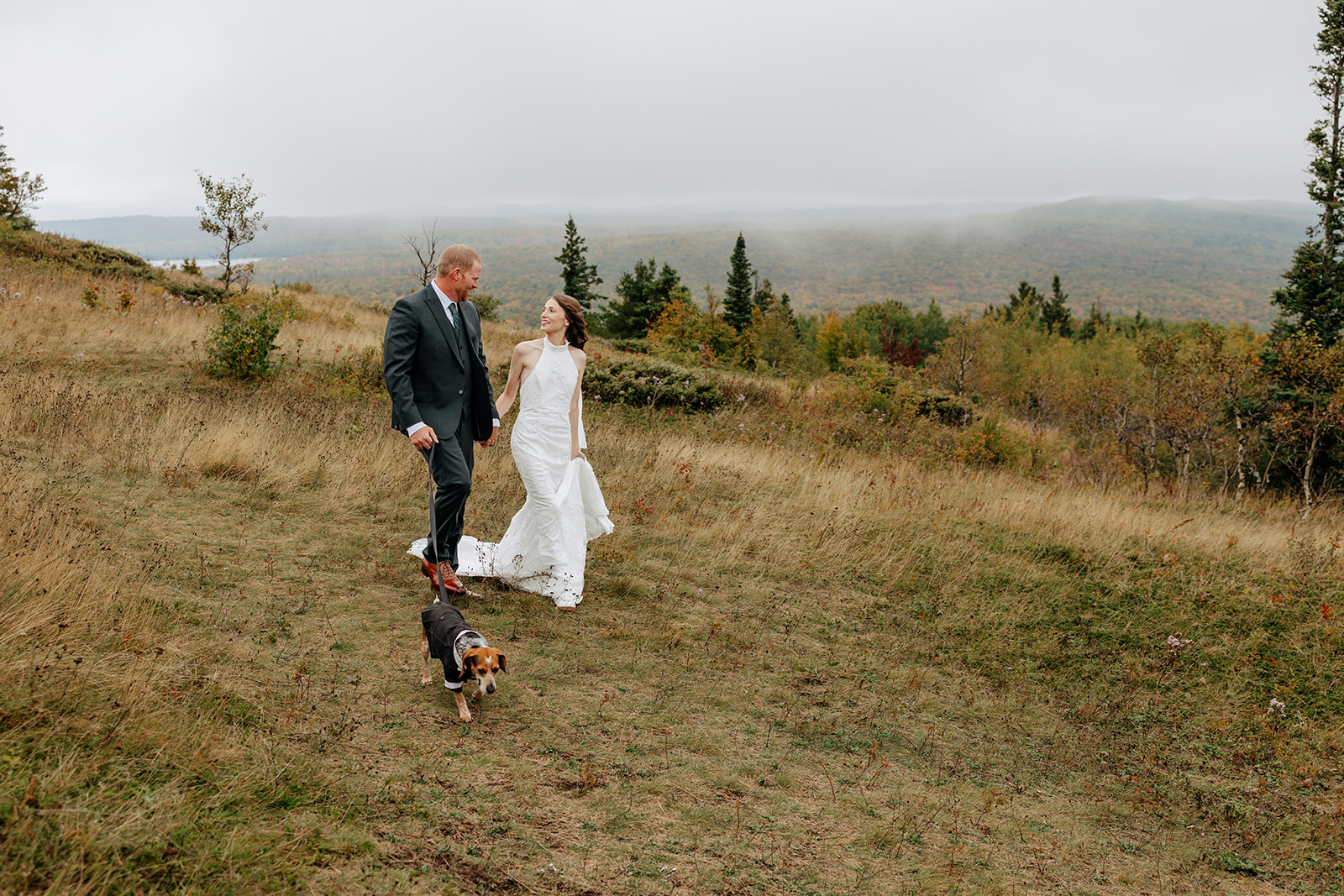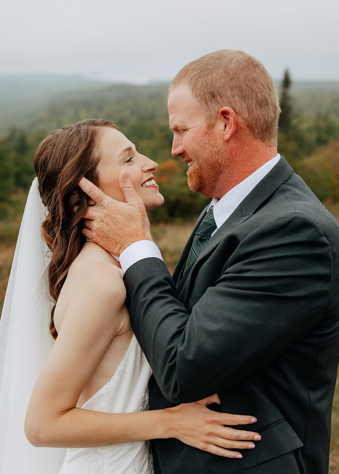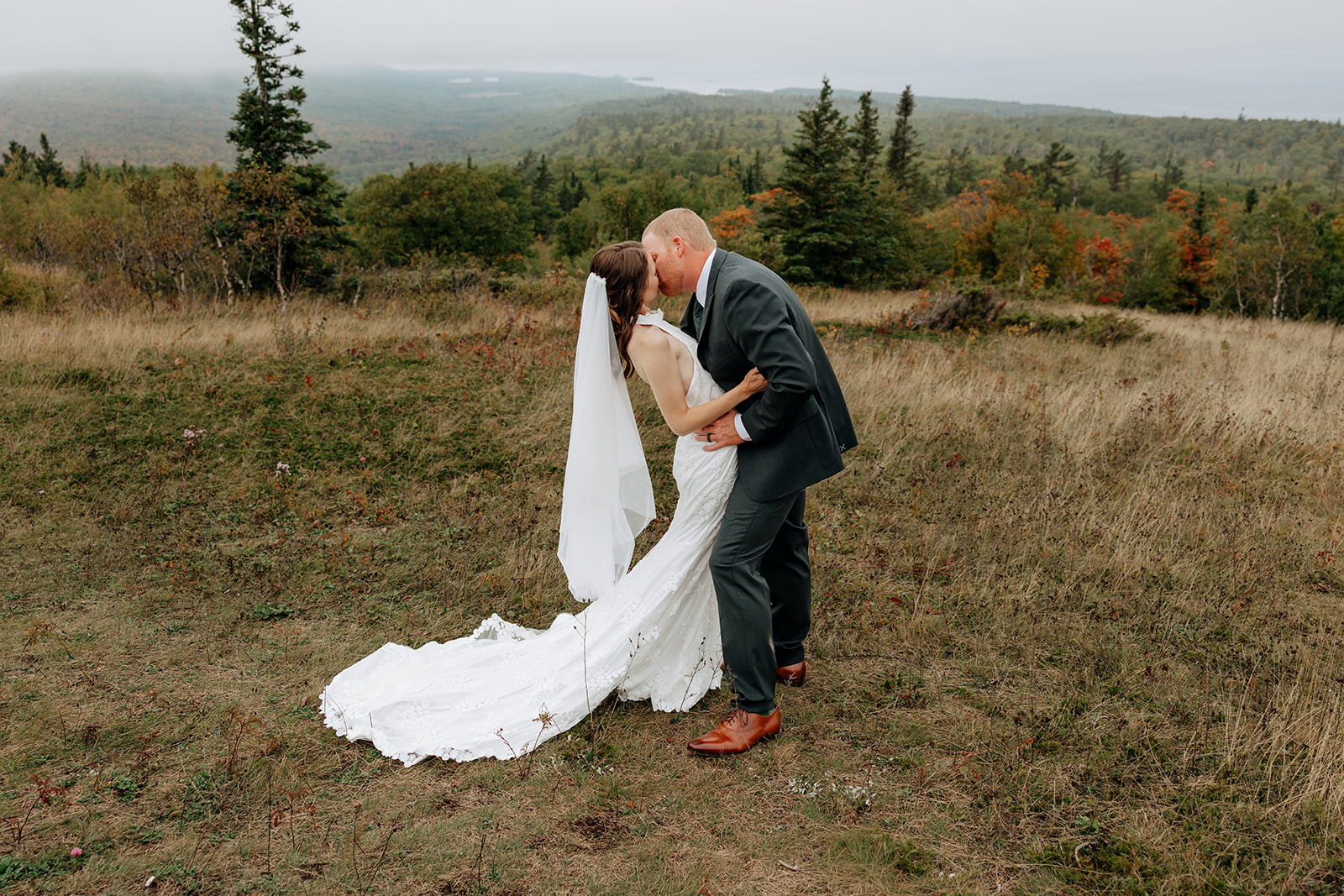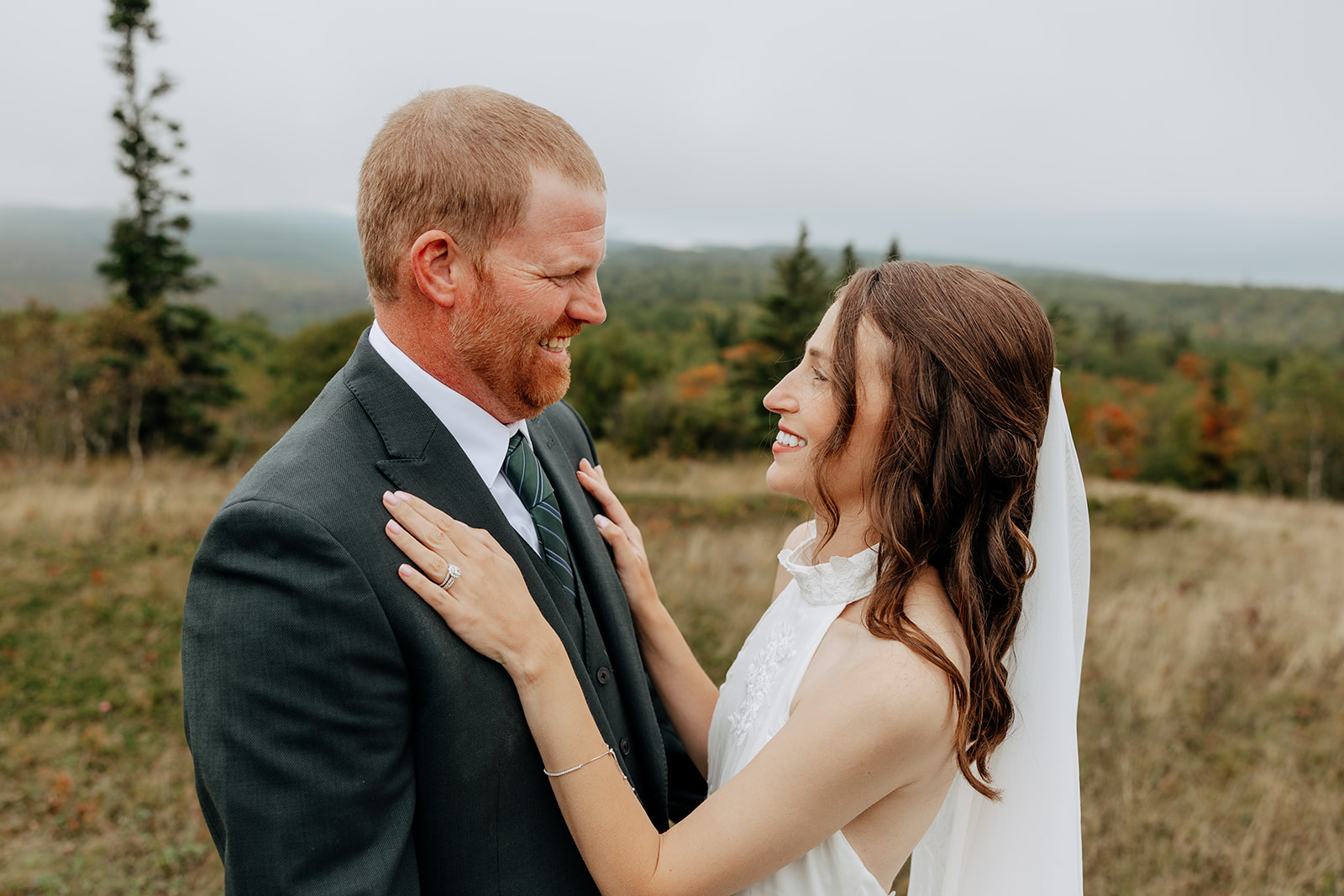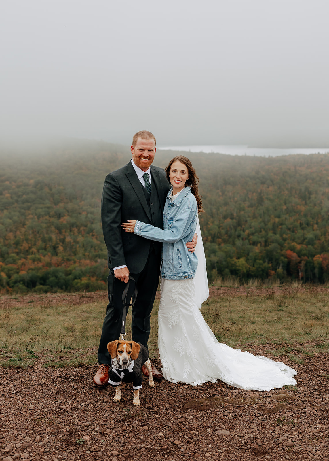 At the top of Brockway Mountain, the view opened up with a little bit of fog, creating a beautiful, moody fall backdrop. Lake Superior stretched out below on either side, and the Keweenaw Peninsula felt quiet and still. Copper Harbor had always been a place Crystal and Scott wanted to see, and standing there together, they got to take in a new place and enjoy the stillness of a weekday elopement.