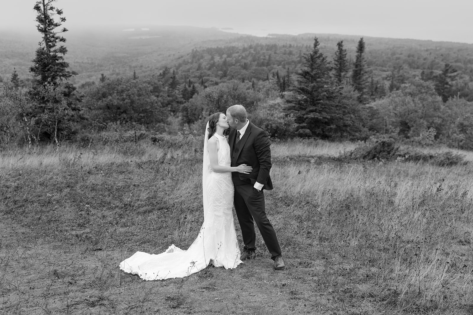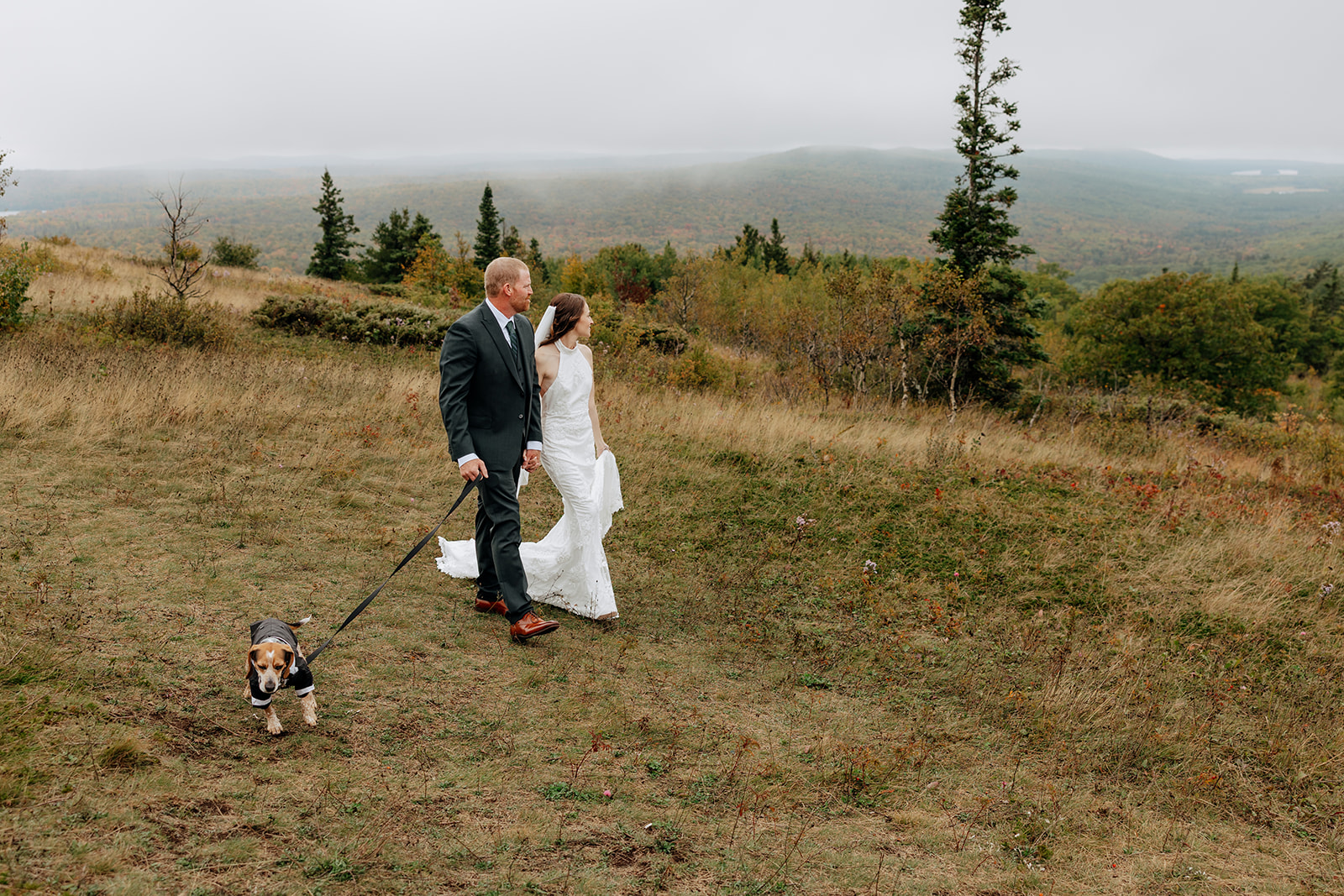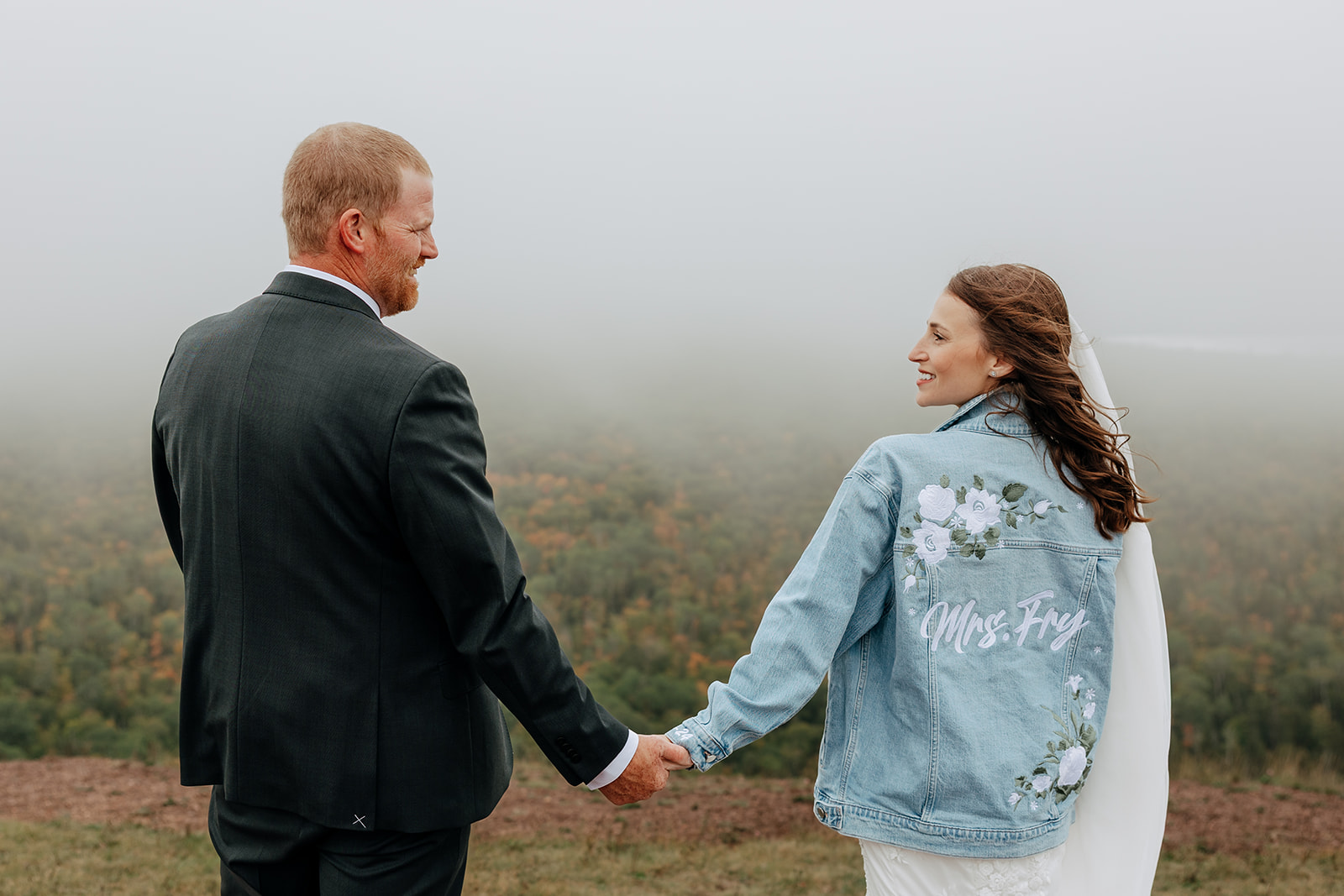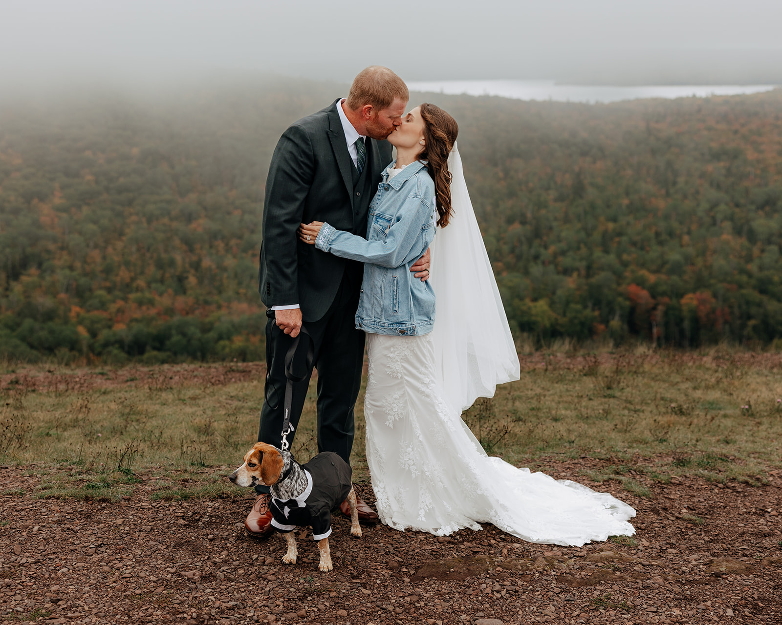 At the top of Brockway Mountain, the view opened up with a little bit of fog, creating a beautiful, moody fall backdrop. Lake Superior stretched out below on either side, and the Keweenaw Peninsula felt quiet and still. Copper Harbor had always been a place Crystal and Scott wanted to see, and standing there together, they got to take in a new place and enjoy the stillness of a weekday elopement.
