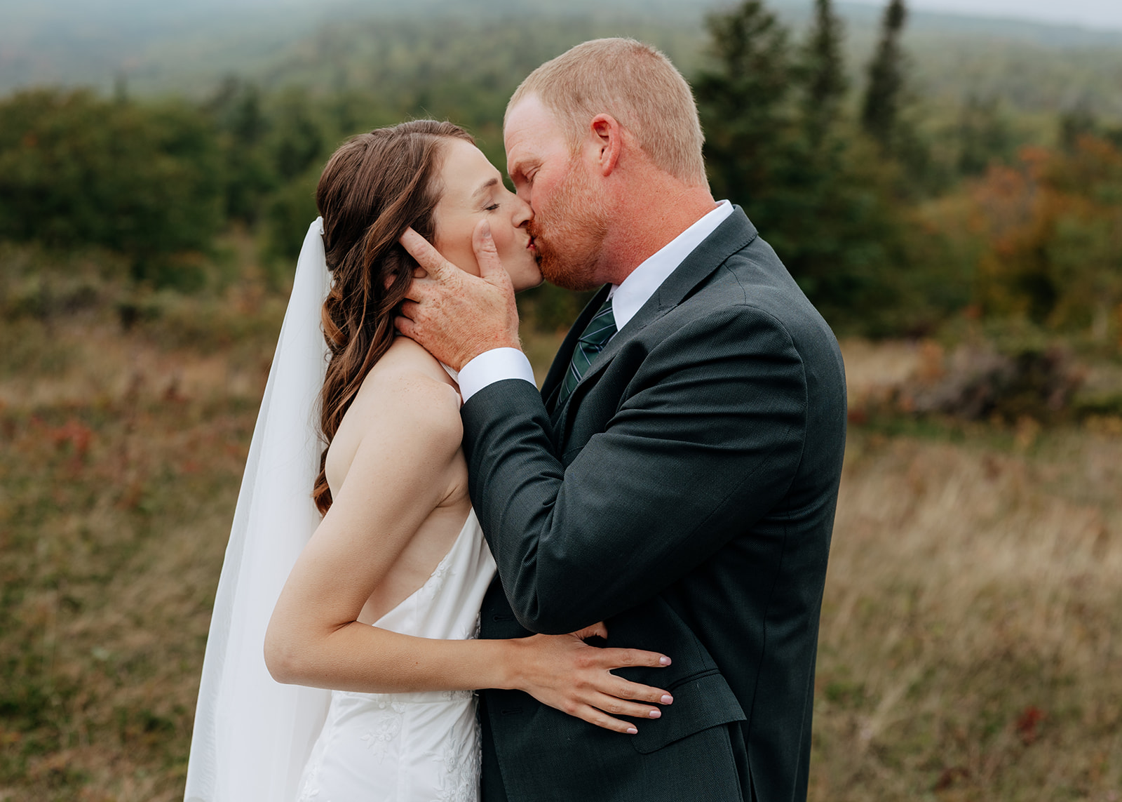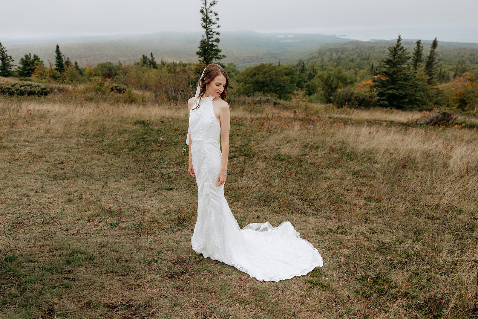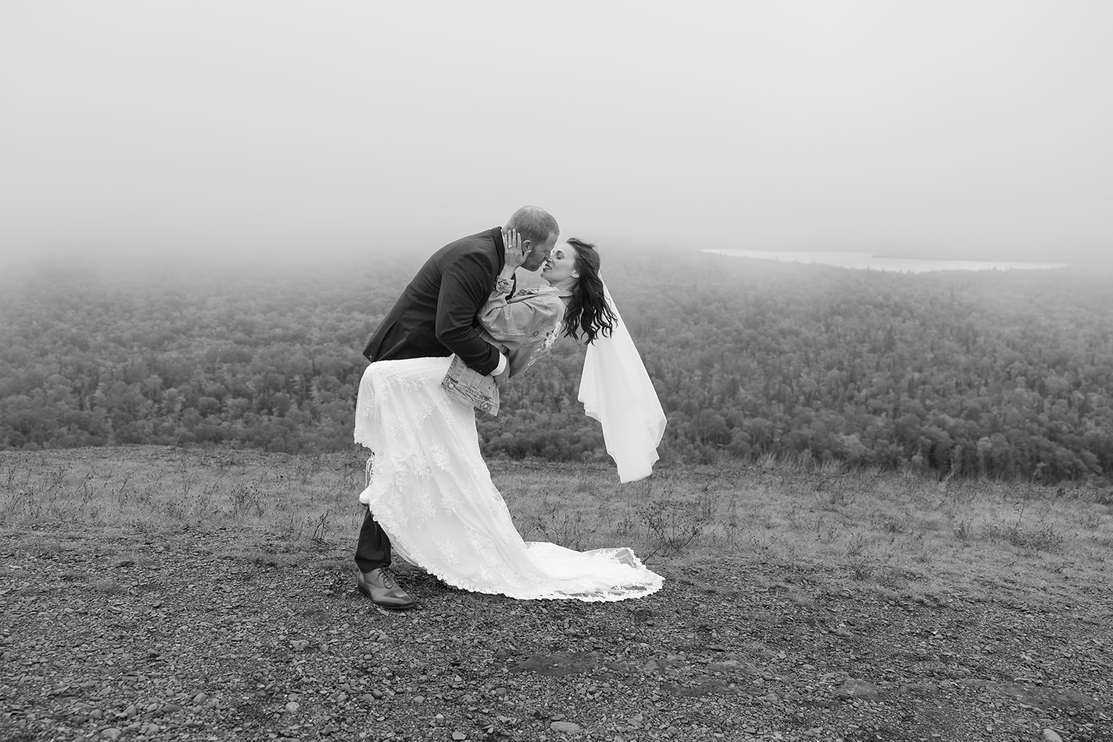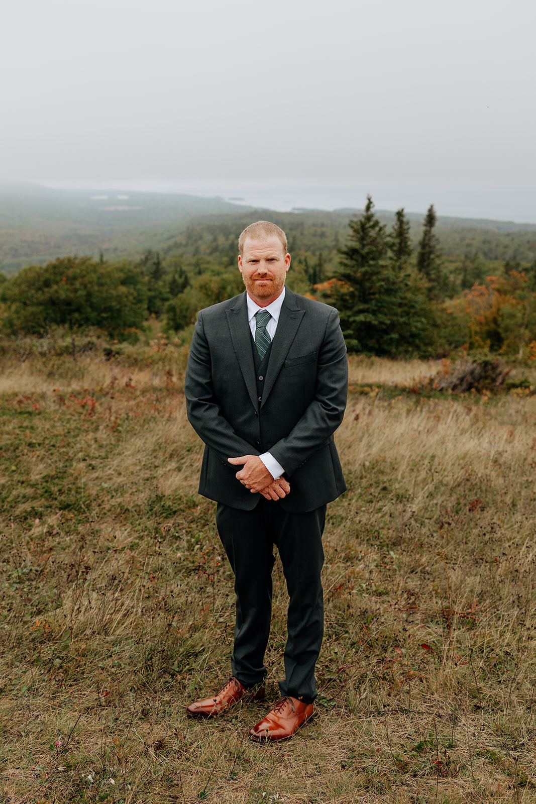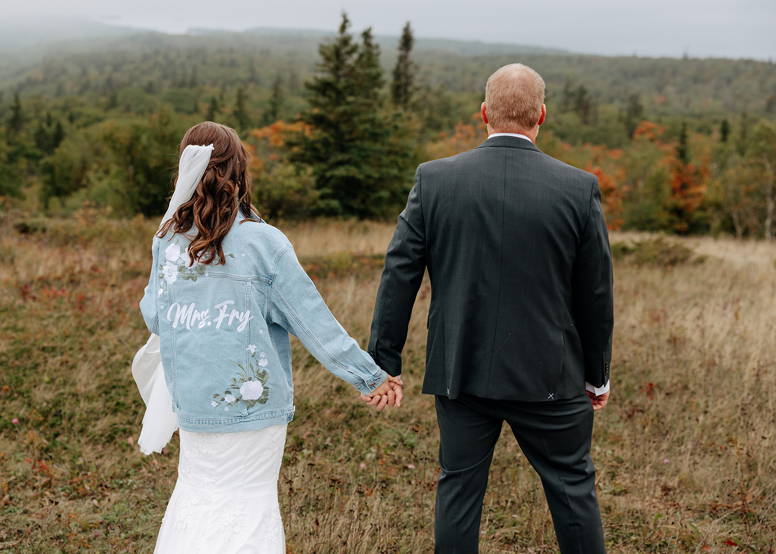 At the top of Brockway Mountain, the view opened up with a little bit of fog, creating a beautiful, moody fall backdrop. Lake Superior stretched out below on either side, and the Keweenaw Peninsula felt quiet and still. Copper Harbor had always been a place Crystal and Scott wanted to see, and standing there together, they got to take in a new place and enjoy the stillness of a weekday elopement.