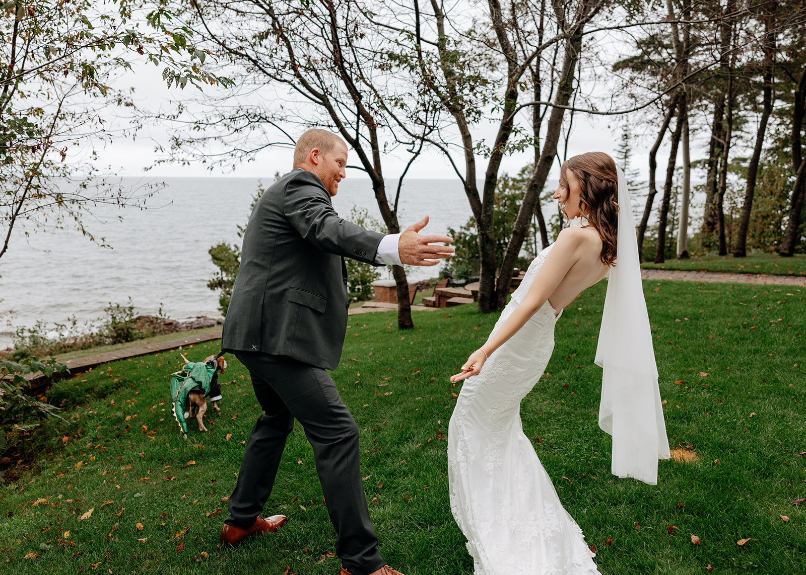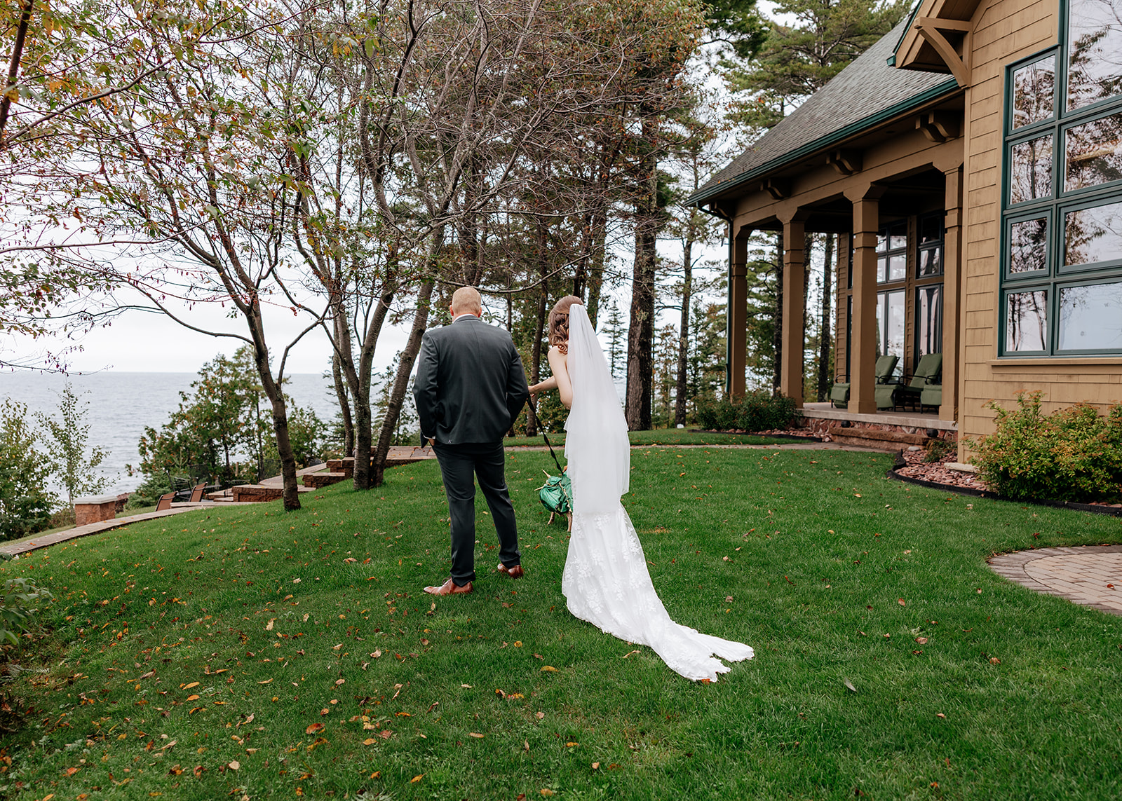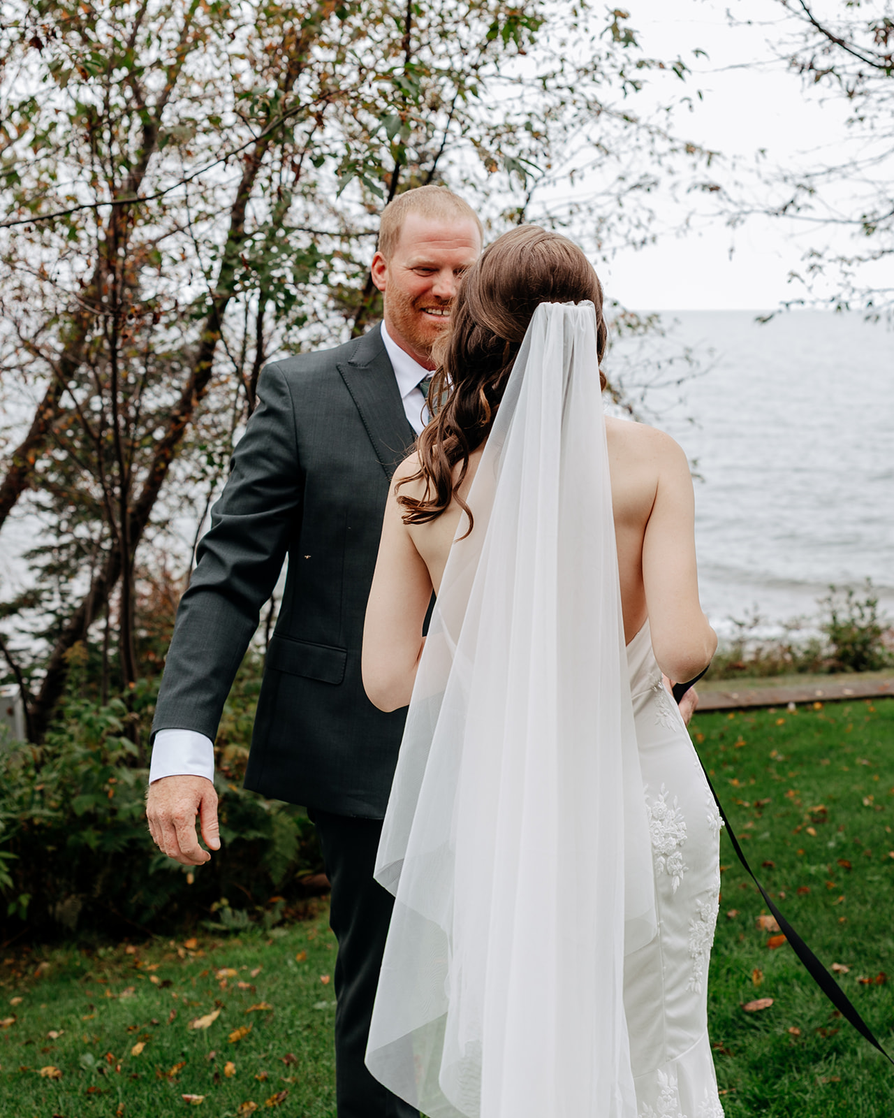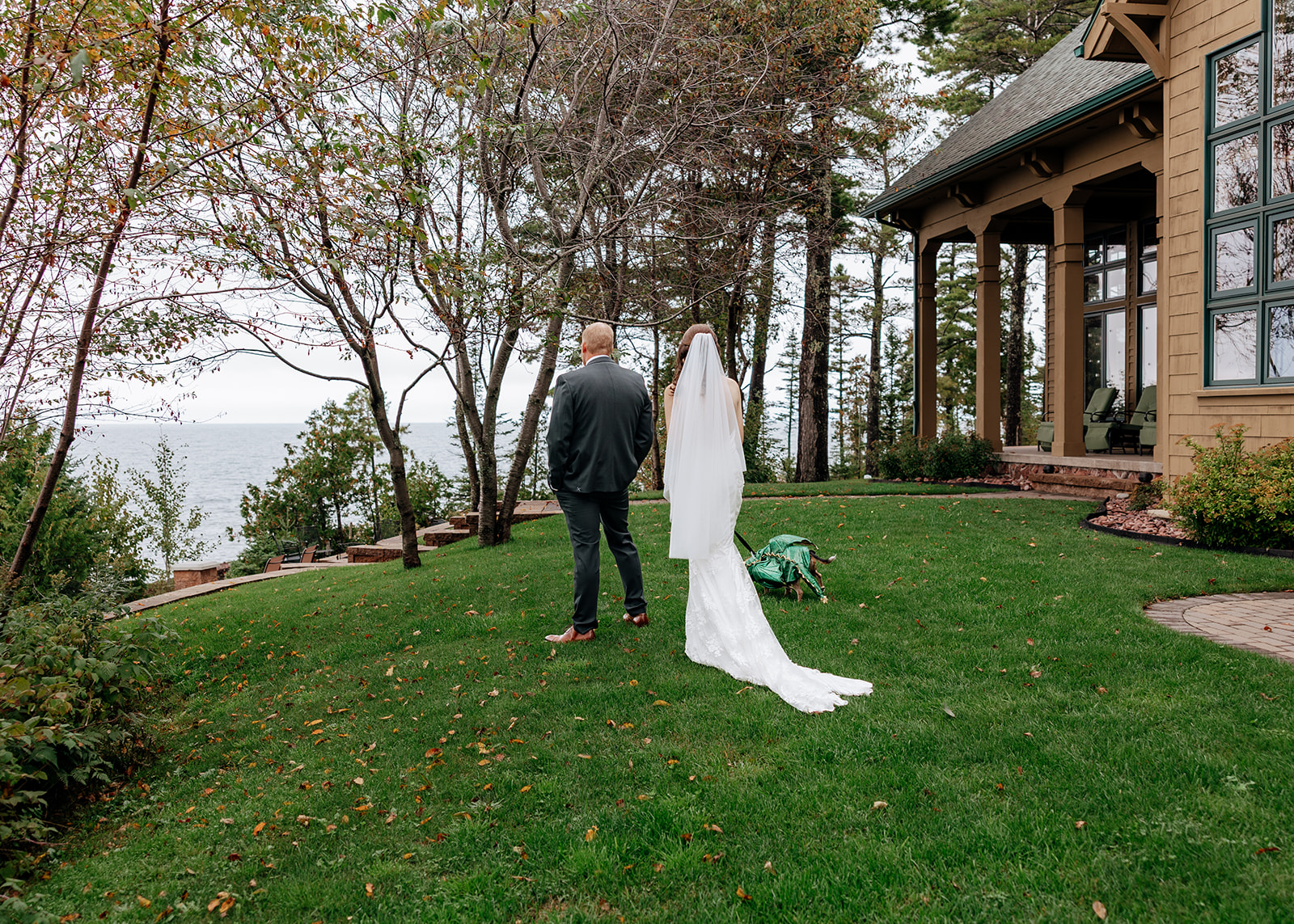 Crystal and Scott got ready at Keweenaw Castle, a venue chosen not just because it’s a beautiful backdrop, but for its calm, supportive atmosphere. Scott put on his suit and stepped outside to take in the view of Lake Superior while Crystal finished getting ready inside. Crystal had chosen a new dress for the day, something special just for this celebration, and a surprise for Scott. When she stepped outside with PhilLee — dressed in his own outfit — Scott saw her for the first time. It was quiet and entirely their own.